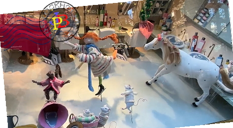 ウィンドーのピッピは、サルのMrニルソン、馬のグッペちゃんと一緒に街中やデパートで自由な面白いアイデアであちらこちらに話題を振りまきます。